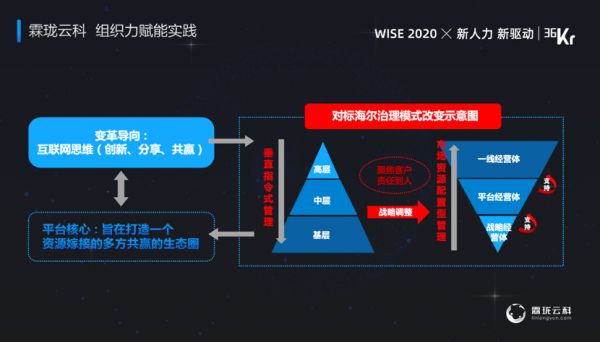 在组织机制赋能层面,霖珑云科也参照了海尔的人人都是CEO的实战案例,这张图上,我们看到,从传统的科层制三角管理转变到今天从一线经营体、平台经营体到战略经营体倒三角的管理。主要有以下变化:
