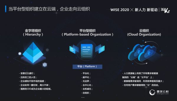 什么是云组织?就是把人放在云端上,跟前面几位老师分享的有一点联系,把工作流、人力流和资金流全部在云上,让员工自己成为CEO,激发组织的活力。三者的差别是什么呢?从薪水上来说,在金字塔科层制管理下,大家是岗位酬,定人定岗,行政经理与总裁办主任拿到薪水是不同的,定岗定薪。平台组织是平台化、无边界,收获的是能力薪、人岗匹配,工资+奖金,多劳多得,也可能有业绩考核。云组织是价值酬,人和任务匹配、让合适的人到更合适的岗位上创造更多的价值。人和任务的匹配,就是刚刚今天讲到的灵活用工,是把任务工作流、共享人才流以及报酬资金流三流合一。