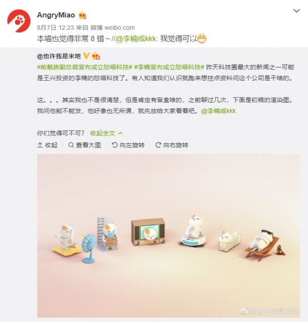 上周,魅族前高级副总裁、CMO李楠在微博上正式宣布成立珠海市怒喵科技有限公司(Angry Miao),获美团龙珠资本数千万元天使轮独家投资。