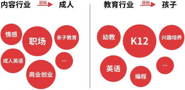 一类的用户是“孩子”,从幼教,到K12,到兴趣培养,以及英语、编程一类的泛技能养成,为了区分,我们也给它强行命名,叫“教育行业”。
