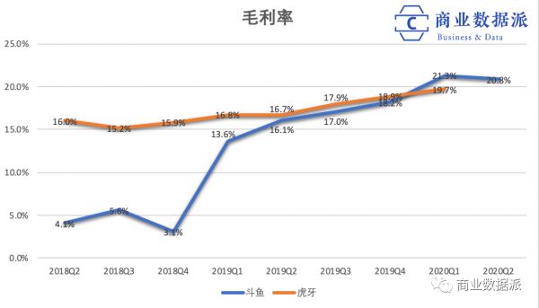 去除掉收入成本,斗鱼与虎牙的毛利率在近两个季度保持在20%左右,值得一提的是斗鱼的毛利率改善明显,2018年时只有3%~5%。