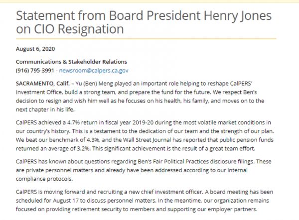 投资界(ID:pedaily2012)获悉,近日加州公务员退休基金(California Public Employees' Retirement System ,即CalPERS)发布声明称,该机构首席投资官孟宇(Yu Ben Meng)已经正式辞职。