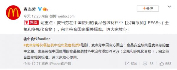 中国麦当劳(又称金拱门)和中国汉堡王则赶紧发了消息,说在中国的食品包装材料里没有添加PFASs。