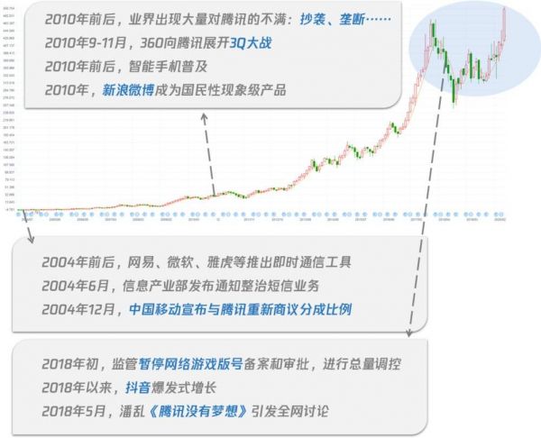 这两件事都是2018年发生的。但是在内外尖锐的吐槽声中,腾讯的股价在近期还是走到了最高点,回顾腾讯从04年上市到现在,股价上涨了1000多倍。(注:腾讯股票在14年1拆5)