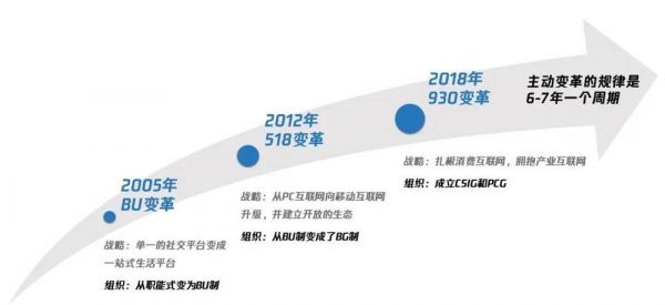 战略上由单一的社交平台变为一站式生活平台,进入到游戏、广告、搜索、电商等领域,组织从职能式转变为BU制。