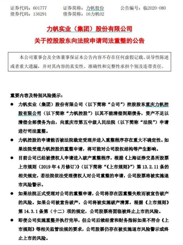 公告还显示,如果法院正式受理对公司的重整申请,公司将存在因重整失败而被宣告破产的风险。换言之,重庆力帆控股公司如今已进入破产重整程序,法院一旦受理案件后,之后力帆还可能面临被终止上市的风险。