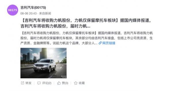 网上有消息称,吉利将会是力帆汽车的接盘手,吉利控股集团负责人的说法是“对此不知情”。而吉利收购力帆股份有限公司,将接管其上市公司壳资源、生产资质、金融牌照以及其重庆工厂,这些对吉利立足西南地区市场都是香饽饽的资源,恐怕李书福对收购事宜也是早有谋划。