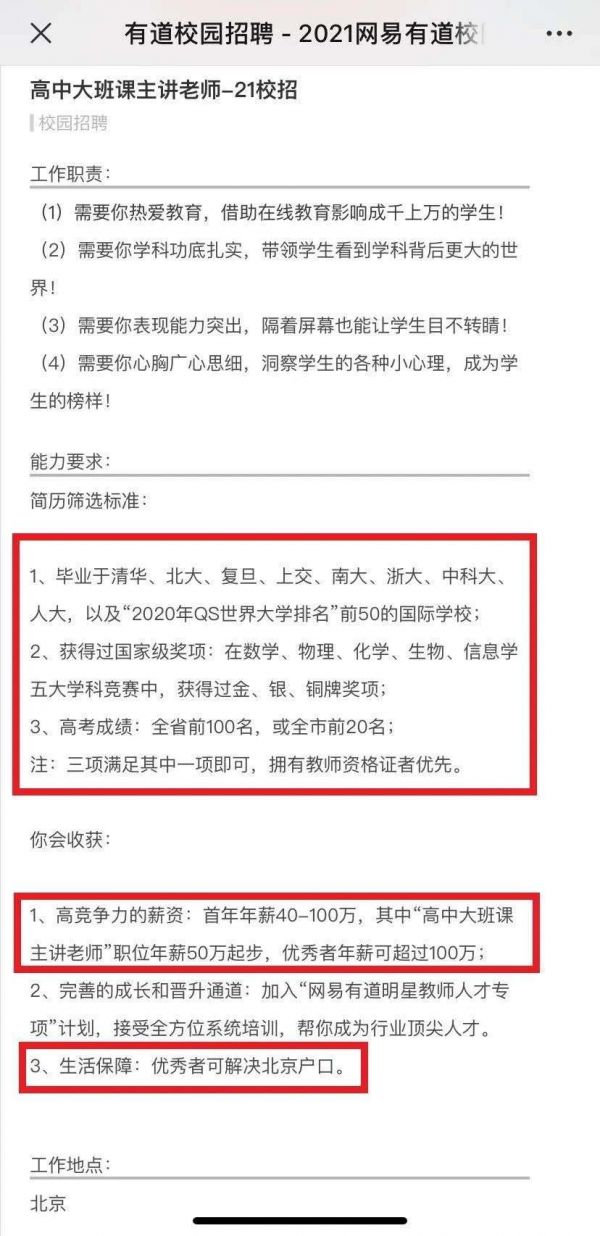 今年互联网教育机构高薪争抢清北等名校毕业生的新闻,再次掀起一轮名校毕业生是否该去做网课老师的讨论。8月初,网易有道精品课发布了一则校招启事:首年年薪40-100万,其中高中大班课主讲老师职位年薪50万起步,优秀者可超100万,要求是毕业于清北复交等名校、获得过国家级奖项、高考成绩全省前100名或全市前20名,这三个条件满足其一。