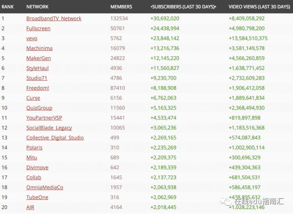 比如下图呈现的美国Top20MCN机构排名。以Top1的BroadbandTV Network为例,它与13万内容创作者(members,从游戏攻略到搞笑等等主题的创作者)签约合作。大量内容创作者,通过BroadbandTV Network集中的渠道、流量、推广策略,获得相对更多的曝光和收入机会。