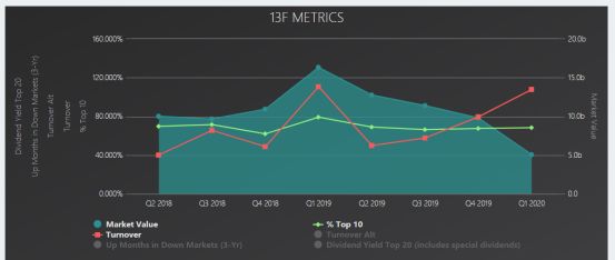 从去年第一季开始,桥水基金的持仓市值就不断下降,但前十大持仓所占比例却不断提升(至最新已升至76%)。第二季基金持仓市值下降尤为明显,换手率(Turnover)高达107%,说明在动荡的市场中,大佬如达里奥也在迅速切换风格,寻找不确定中的确定性。