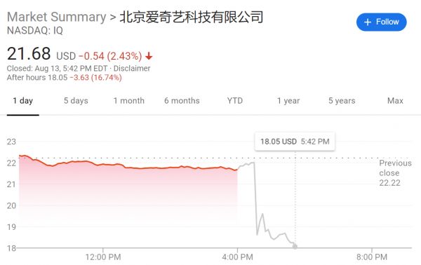 爱奇艺股价13日收跌 2.43%,报 21.68 美元。而在这份披露后,爱奇艺股价盘后一度大跌19%,截至北京时间14日早间5点半左右,爱奇艺股价在盘后时段的跌幅16.74%,暂报18.05美元。