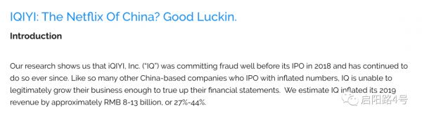 今年 4 月,爱奇艺被 Wolfpack Research 做空。做空报告认为,爱奇艺早在 2018 年首次公开募股之前就存在欺诈行为,并一直持续至今。Wolfpack Research 估计爱奇艺将其 2019 年的收入夸大了大约 80亿~130 亿人民币,即 27%-44%,爱奇艺通过夸大约 42%-60% 的用户数量来实现此目的。此外,报告认为,爱奇艺夸大了其为内容、其他资产和收购支付的成本,通过烧假钱,向审计师和投资者隐藏欺诈行为。