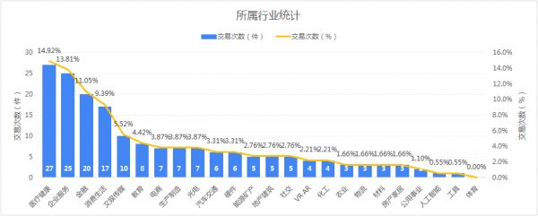 在赛道分布看,本周Top 3热门融资赛道分别为:医疗健康(27笔,占比14.9%)、企业服务(25笔,占比13.8%)、金融(20笔,占比11.0%)。医疗健康行业独占27笔,获得最多资本青睐。此外,企业服务行业紧随其后,融资数量排名稳居第二。