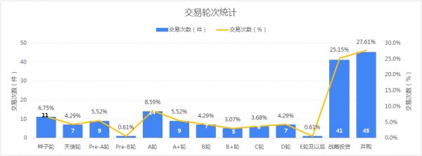 从融资轮次看,项目集中在并购和战略投资,其中并购45笔、战略投资41笔。其中战略投资相比上周(10笔)数量增加显著,A轮投资相比上周(17笔)略有下滑。