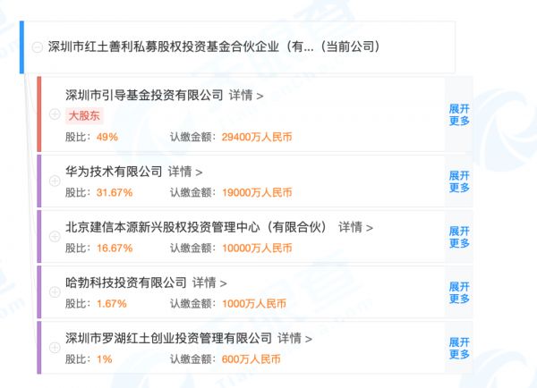 除了华为,该新基金的其他LP来头都不小。红土善利最大的股东为深圳市引导基金投资有限公司,认缴2.94亿元人民币,持股比例49%。