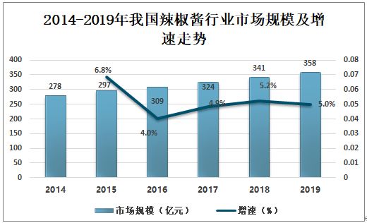 按照最保守的预测数据,2014年,中国辣酱行业市场规模为278亿元;2018年增长至341亿元,辣酱占80%的调味酱市场;预计到2020年底,中国辣酱市场规模将达到400亿元,年均复合增长率达到5%-7%。这样一个市场,在规模上仅次于700亿+的酱油行业。
