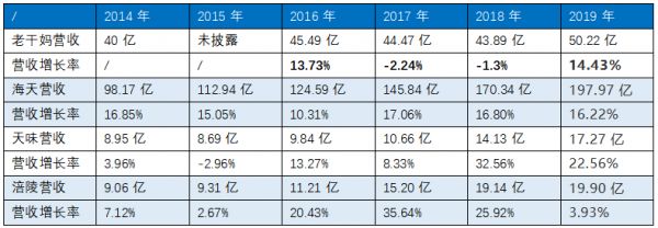 2014年~2019年的5年之间(2015年未披露),老干妈的销售收入分别为40亿、45.49亿、44.47亿、43.89亿元、超50亿元。对比同为调味品的海天味业、涪陵榨菜、天味食品在这若干年动辄 20%-30% 的增长情况,老干妈固有其“稳如山”的特点,在增长性上却略显逊色。