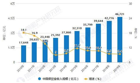 四十年间,餐饮市场规模从1978年的54.8亿元升至2019年的46721亿元,攀升853倍。即使拉至最近的10年,2019年的餐饮规模也是2010年的2.65倍。