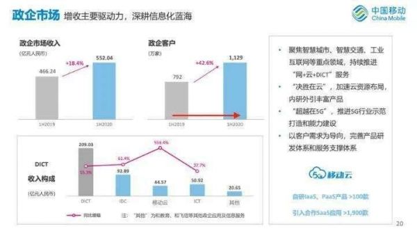 其中,移动云收入45亿元,增长556.4%。中国移动在财报中预计,到2022年进入国内云服务商第一阵营。此外,中国移动透露,上半年政企客户数达到1129万家,较2019年底净增101万家。