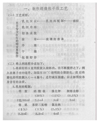 超微粒干版作为光刻制版用的感光版的一种,其制造工艺的相关内容,无论是在《光刻掩模的制造》,还是在前辈的亲述当中都有过介绍。其底板采用性能稳定、透光率高的玻璃或塑料薄膜。感光膜由硝酸银、卤化钾和介质(明胶)三种材料为主配成乳胶液,再加入吡那金醇(增感剂)、三氮吲哚唎嗪(稳定剂)、明矾(坚膜用)等构成,书中截图如下: