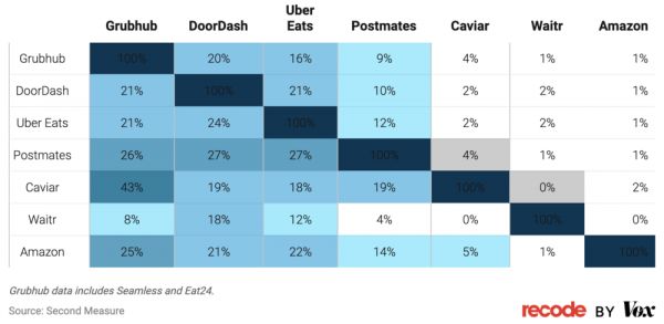和谁给的补贴多就用谁叫外卖的中国用户一样,美国的消费者也没有忠诚度可言,几家外卖平台的客户重合度不算低。