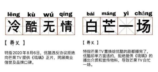 然而8月5日,优酷方的官宣文案为“优酷全网独播”。8月6日,芒果TV官方微博直接发布了一篇“致歉声明”,称某平台“于2020年8月5日晚突然单方面提出解除合同,并拒绝向芒果TV交付播放介质,导致该剧无法在芒果TV与大家见面”。相关舆论武器也马上跟进,成语“冷酷无情”与“白忙一场”又出新解。