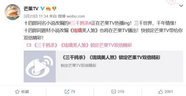 8月6日,也就是《琉璃》开播当天,出现了一个小插曲。该剧虽有优酷参与出品,但早在今年3月便宣布过,将于芒果TV播出,也就是优芒联播。硬糖君推测,当时双方可能是就《三千鸦杀》进行了置换,后者是芒果TV重金定制、寄予厚望的剧集项目。