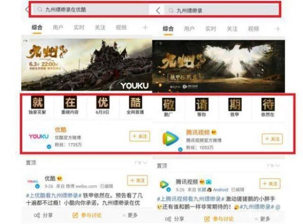 这种小学鸡battle,网络平台之间也不能少。就在同一个夏天,大IP《九州缥缈录》一台双网播出。腾讯视频先买了热搜词条,置顶是腾讯视频官微;隔天优酷就买了“九州缥缈录在优酷”,与之唱对台。