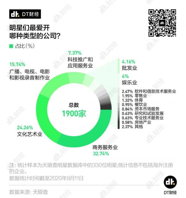 根据天眼查的资料,我们找到了330名在工商局注册过公司的明星,公司总数也达到了惊人的1900家。平均下来,每个明星开了5.76家公司。