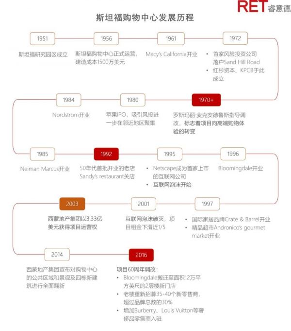这其中,70年代初、80年代中、90年代后期是关键变革的节点,分别是项目从社区商业向区域目的性商业转型的起点、起势、爆发时点。而这些时期的商业调整动作,均由斯坦福大学自己的商业运营团队策划执行。