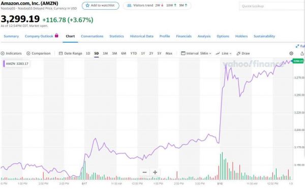 传出亚马逊将扩大实体办公室规模当天,本周二亚马逊股价高开高走,午盘涨幅扩大到3%以上,继续领涨FAANMG六大科技股。