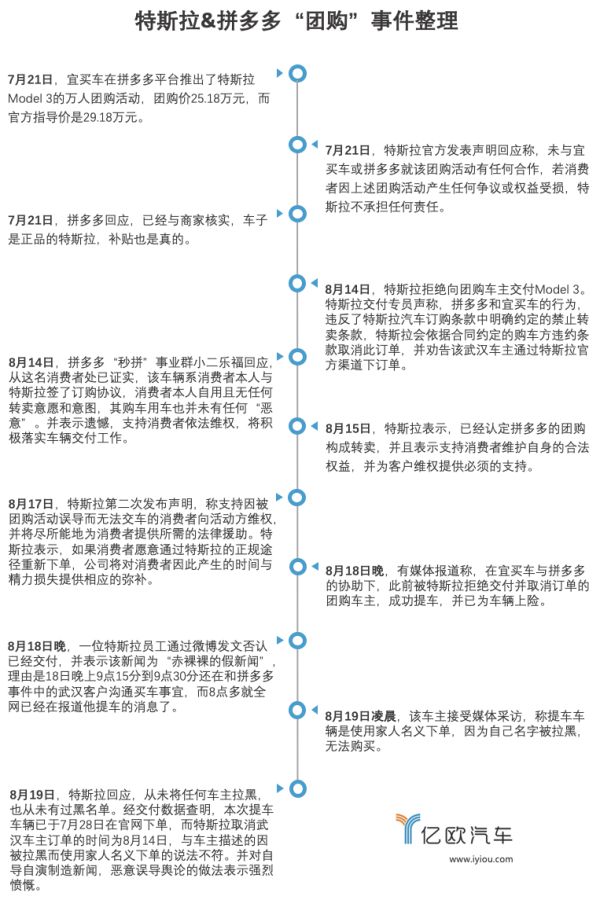 7月21日,宜买车在拼多多平台推出了“特斯拉中国-Model 3 2019款标准续航后驱升级版”万人团购活动,团购活动价25.18万元,比补贴后的车价便宜了近2万元,随后特斯拉回应无合作且不负责,双方就此进行了一场博弈。