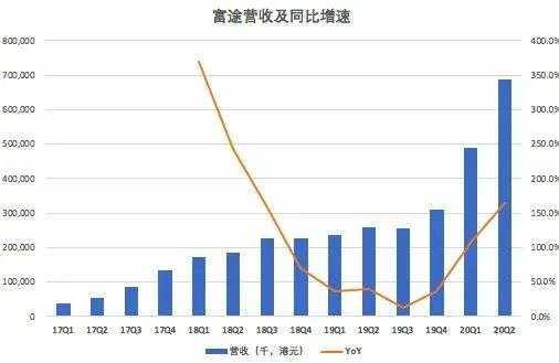 富途营收规模和赚钱能力完胜老虎证券。财报数据显示,2020年Q2富途实现6.88亿港元(约8870万美元)的营收,较上年同期的2.60亿港元,增长165%,较上一季度的4.91亿元港元,增长40%。