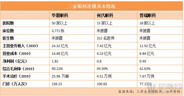 在业务收入上,三家眼科连锁主要以视光(配镜)、屈光(近视手术)、白内障手术这三大业务为主。根据这三家企业的招股书,2019年,何氏眼科的视光服务占主营业收入的30.07%,屈光占20.84%,白内障占20.39%;普瑞眼科视光服务占主营业收入的15.37%,屈光占45.54%,白内障占23.13%;华厦眼科没有细化阐述,招股书显示眼科医疗业务占主营收的90.04%,配镜业务占9.18%。