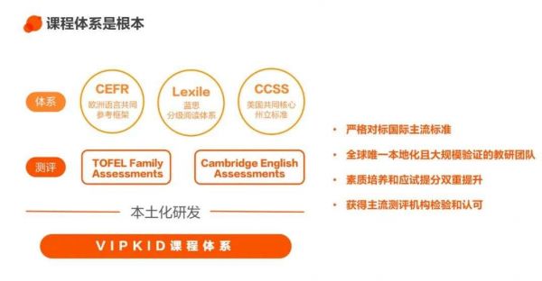 课程体系,是机构良好稳定发展的根本。作为深耕少儿英语教育的公司,VIPKID吸纳国际主流测评体系,尽最大可能“取其精华”,进行本土化研发。截至目前,VIPKID已经对标CEFR、Lexile和CCSS等国际主流标准,并引入剑桥、托福等主流测评体系,进一步做本土化研发工作。通过不断完善、打磨,形成自己独有的课程体系,最终获得用户和主流测评机构的检验和认可。