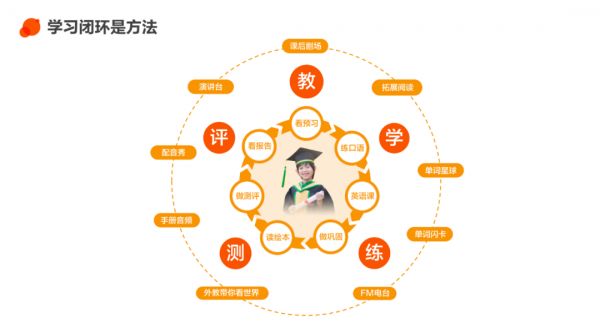 依据教学过程中的5个重要环节“教、学、练、测、评”,VIPKID构建出内环+外环两大学习闭环。内环构建核心学习体系,外环拓展学习产品驱动,打造一个完整闭合的学习过程。
