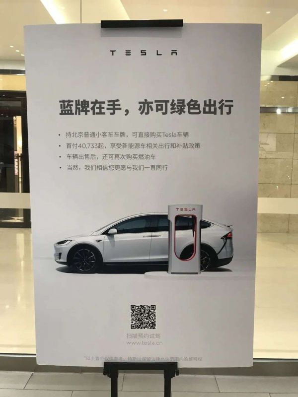 前述特斯拉北京店员向出行一客介绍,有不少消费者是用燃油车的指标来购买特斯拉车辆,特斯拉也鼓励有燃油车的消费者置换特斯拉车型。从金融政策上来看,消费者用燃油车置换特斯拉新车的话,三年利率是8%。而用其他新能源车来置换特斯拉的三年利率是9.9%。在店内的显要位置,也悬挂着“蓝牌在手,亦可绿色出行”的广告牌。