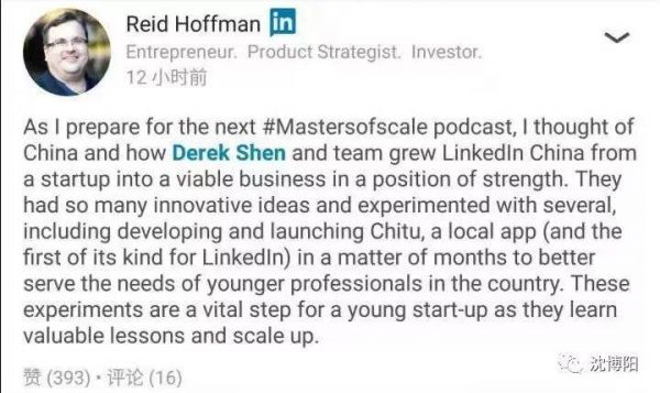 3. 赤兔得到了领英全球董事长Reid和CEO Jeff两位大佬的鼎力支持。直到2017年6月底我辞职离开领英的时候,Reid还在领英上写下了以下这么一段话,对领英中国用创业公司的方式做事,以及赤兔做为一个创新型App的有益尝试做出了高度的评价,令人印象深刻。