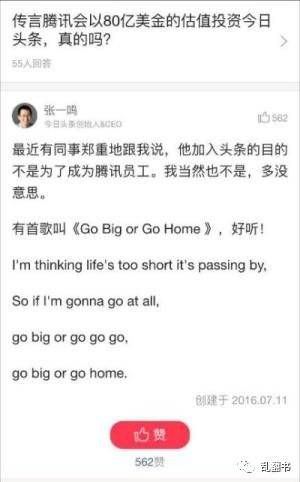 在一个名为《传闻腾讯会以80亿美金的估值投资今日头条,真的吗》的今日头条的问答帖中,张一鸣做了个表态:加入头条不是为了成为腾讯员工,想在“斗争”中Go Big。