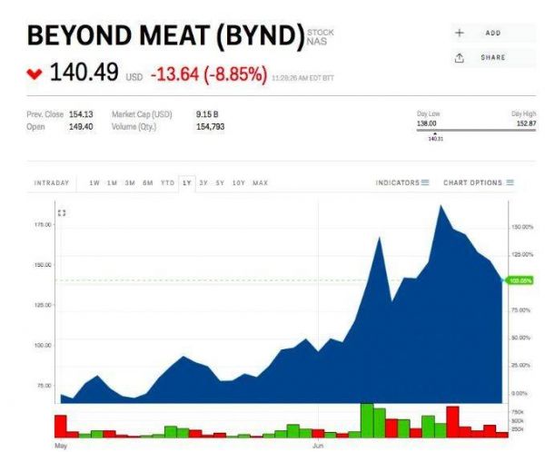 然而,6 月 17 日,Beyond Meat 这支获比尔·盖茨加持、有“金融危机以来最佳IPO”之称的股票,突然遭遇开盘大幅下挫,最终暴跌 25.02% 至 126.04 美元,逾一月涨超 6 倍的神话止步。