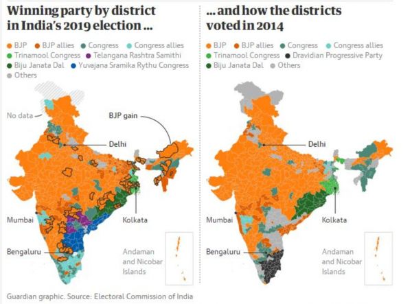 穆迪,堪为一位政治强人,他推崇企业发展,鼓励大企业和商业进步,促成经济的强力发展。下图为两次竞选中,穆迪获得选票的情况,黄色区域即为所获选票区域,得票率可称印度有史以来最高。
