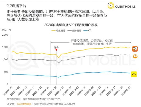 而深层次原因或许是因为YY已经不再是当年的“小年轻”。经历过中国直播行业的初创草莽期,也经历过2016年直播行业巅峰期的“千播大战”,如今YY虽然还在为欢聚集团贡献着现金流,但这很可能是YY最后的辉煌。据QuestMobile数据显示,今年年初的日活用户YY与虎牙斗鱼有着非常明显的差距。