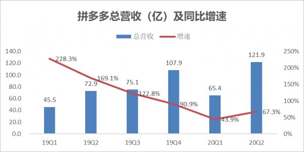 二季度,拼多多总收入121.9亿元,同比增长67.3%。其中,线上营销服务收入规模达到110.5亿元,增幅70.9%;交易服务收入11.4亿元,较去年同期增长38.4%。