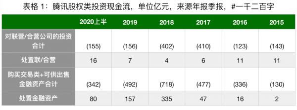 先制作一张关于腾讯股权投资的现金流表格。由于季报中没有披露现金流的明细,无法查看投资相关的现金流金额,这里用季报后边附注中“于关联公司的投资变动”和“以公允价值计量且其变动计入损益/其他综合收益的金融资产的变动分析”对2020上半年情况做一个估算。