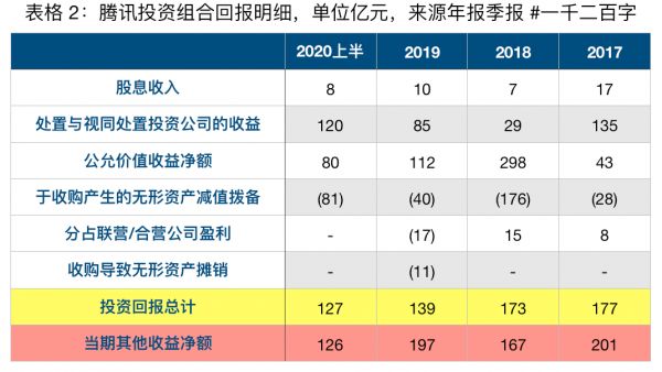 从2017-2019这三年看,投资回报分别是177亿、173亿、139亿,略有下降,看明细2019年主要是因公允价值收益净额下降所致。另根据2020上半年“其他收益净额”明细估算出的投资回报大概是127亿,又有提升迹象。这说明,虽然腾讯愈发倾向于将一些关联公司变成子公司,将其从投资收益中“剔除”出去,但相比于关联公司投资和手握金融资产的庞大基数,这种变化对投资回报带来的影响很小。