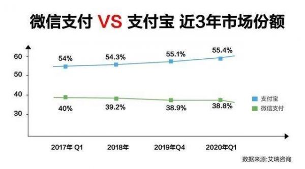 时至今日,移动支付市场格局再无大的波澜。“多维对高频”,支付宝、微信常年分占55%和40%左右的市场份额。