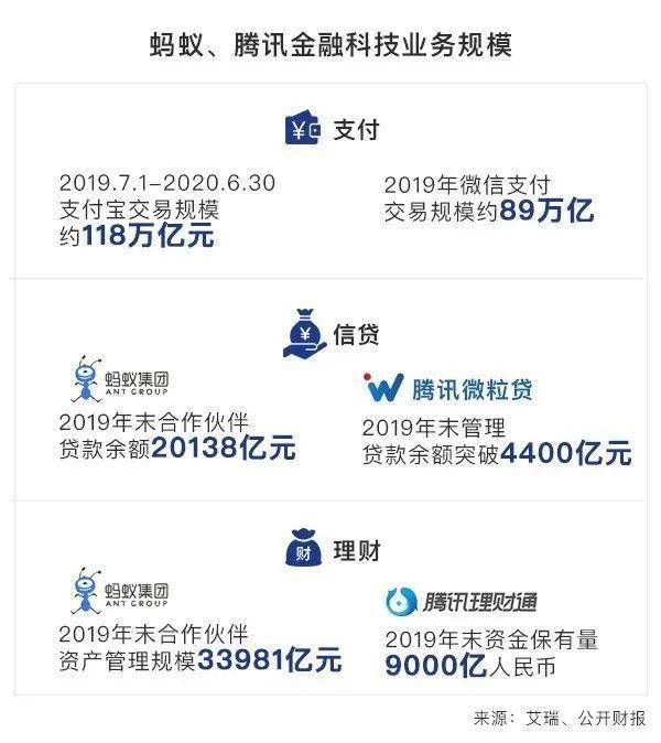 按照市场分析机构的统计和公开资料,这些板块规模均超过腾讯对应的微粒贷、理财通、微保业务。蚂蚁集团在招股文件中用三个“最大”来形容自家的数字金融业务,中国最大的线上消费信贷和小微经营者信贷平台、最大的线上理财平台、最大的线上保险服务平台。