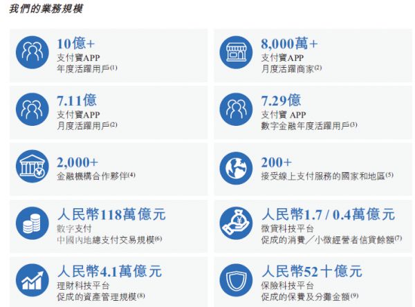 截止2020年6月30日止的12个月内,通过蚂蚁集团的平台完成的中国内地总支付交易规模达到118万亿元人民币。同一时间内,通过蚂蚁集团的平台完成的国际总支付交易规模达到6220千亿元人民币。