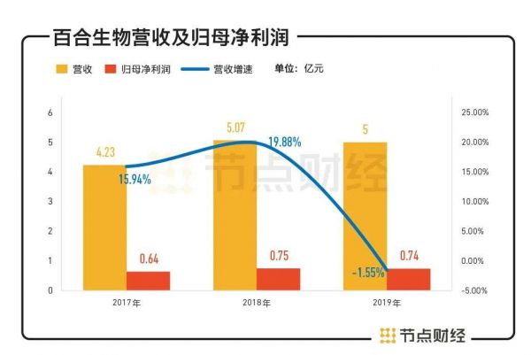 2017-2019年,百合生物的营业收入分别为4.23亿元、5.07亿元、5.00亿元,增速分别为15.94%、19.88%、-1.55%,归母净利润分别为0.64亿元、0.75亿元、0.74亿元。可以看出,2019年百合股份的营收和净利润对比去年同期双双下滑。
