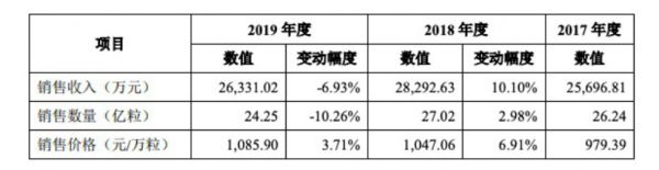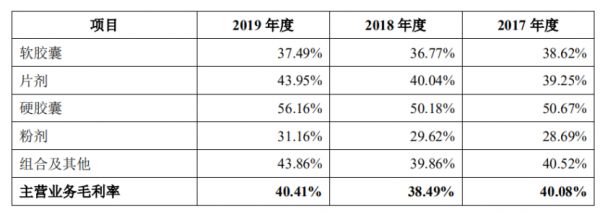 在百合生物的主营业务中,最赚钱的是软胶囊产品,2017-2019年,其占主营业务收入的比例分别为61.27%、56.46%和 53.26%。但在2019年,软胶囊的销售收入与销售数量却双双下跌,分别为2.63亿元,24.25亿粒,比上一年同期分别下降7%与10%。